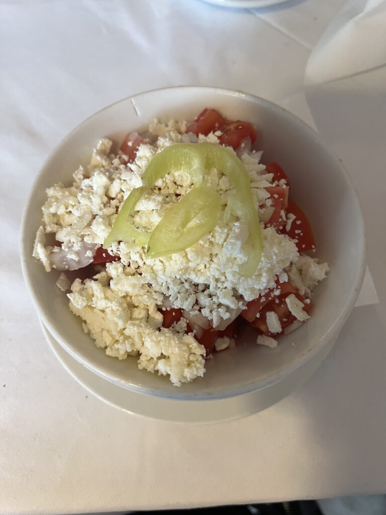 🥗 Sałatka szopska – znana na całych Bałkanach sałatka z pomidorów, ogórków, papryki i sera, idealna lekka przekąska w karmiącym się cieniu drzewa lub nad brzegiem rzeki.