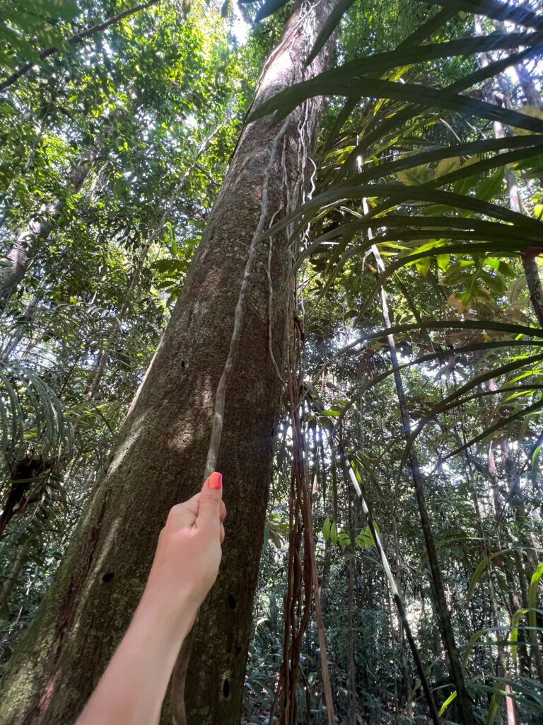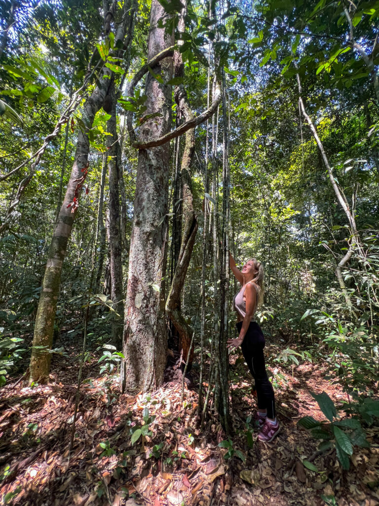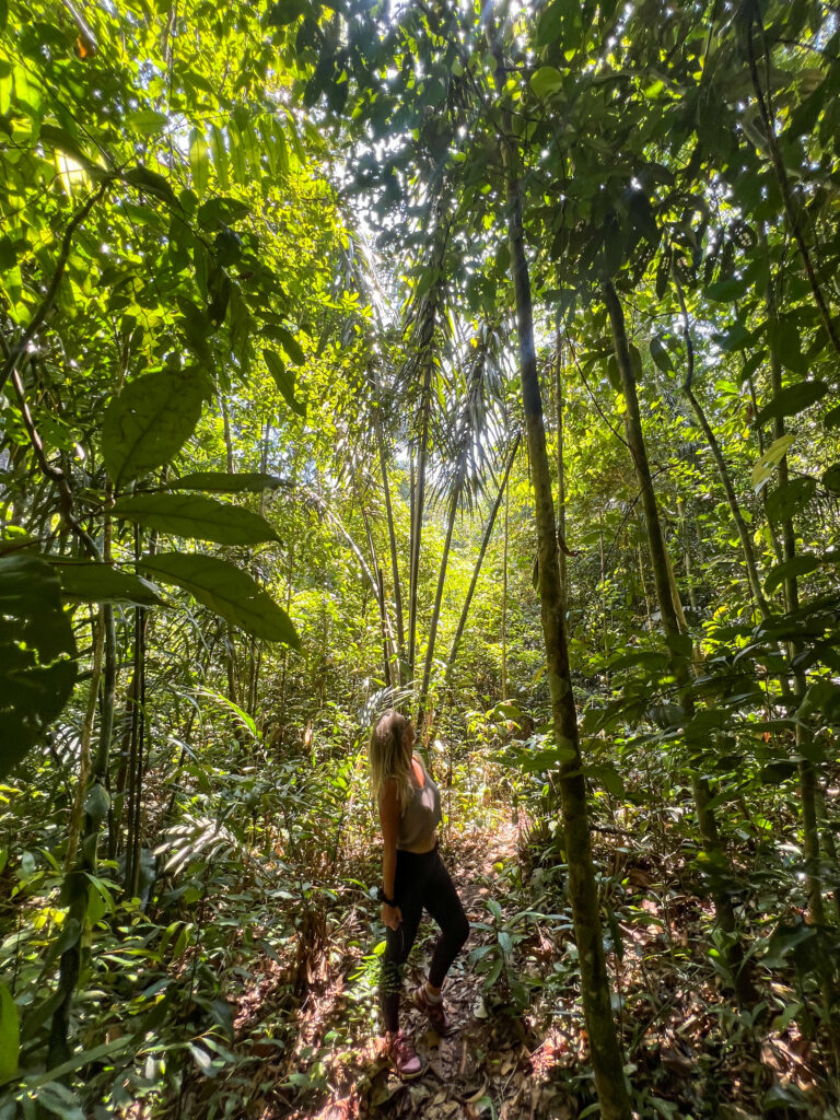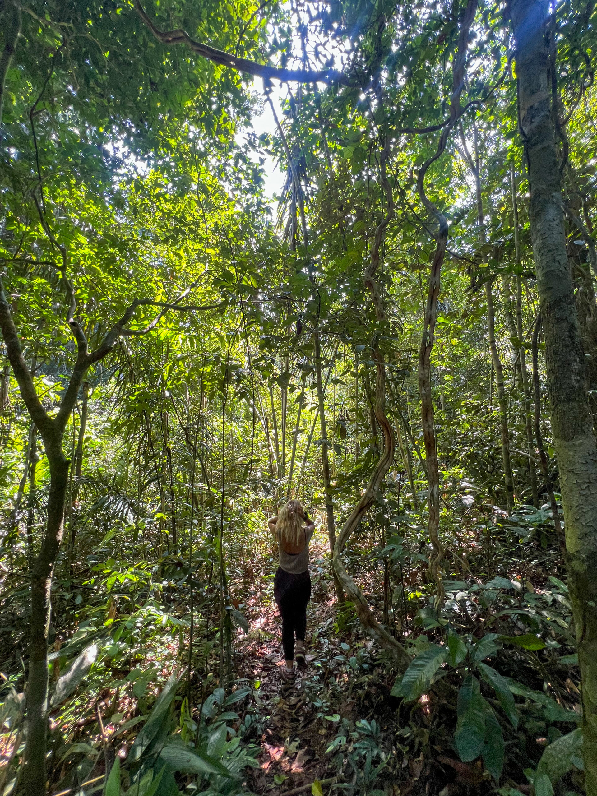 Nasza wycieczka rozpoczęła się od około dwugodzinnego spaceru po lesie deszczowym, który jest domem dla około 10% znanych gatunków na Ziemi. Szlak, którym szliśmy był dobrze utrzymany dzięki temu ten spacer był bardzo przyjemny. Lokalni przewodnicy znali teren jak własną kieszeń, to dzięki nim tak naprawdę cała ta przygoda była wspaniała. Cały czas zatrzymywali się i pokazywali nam przeróżne roślin oraz jak się udało, np. owady 🙂 Między innymi pokazali rośliny, które magazynują wodę (super przydatne, jeśli ktoś się zgubi), ale też te, które trzeba uderzyć kiedy się zgubimy, a ich echo może się nieć nawet na 2 km. Oczywiście były też liany, takie, na jakich tarzan się bujał ale mi nie szło. I te palmy ta zieleń….naprawdę czuć było, że to prawdziwa, dzika dżungla.