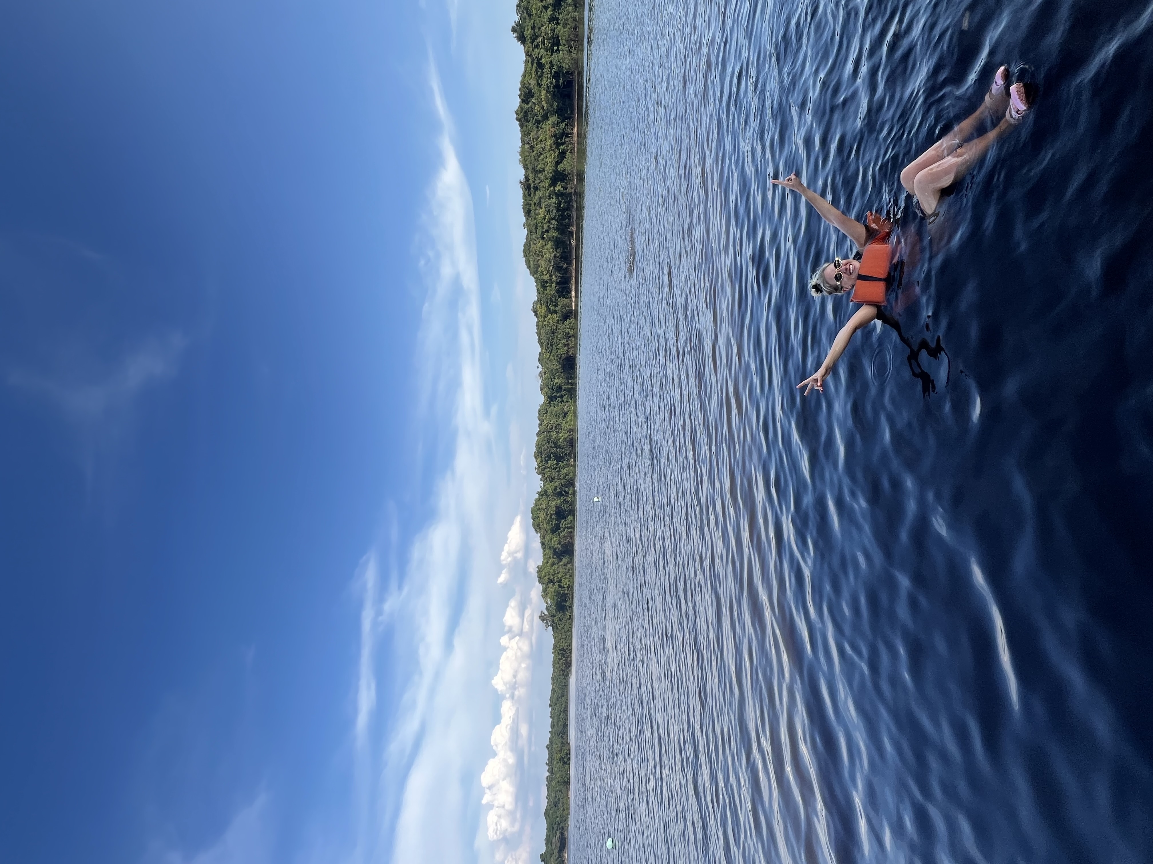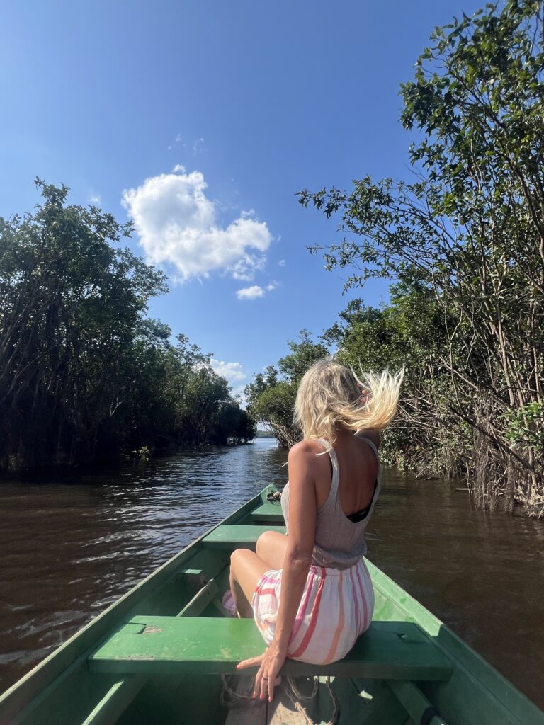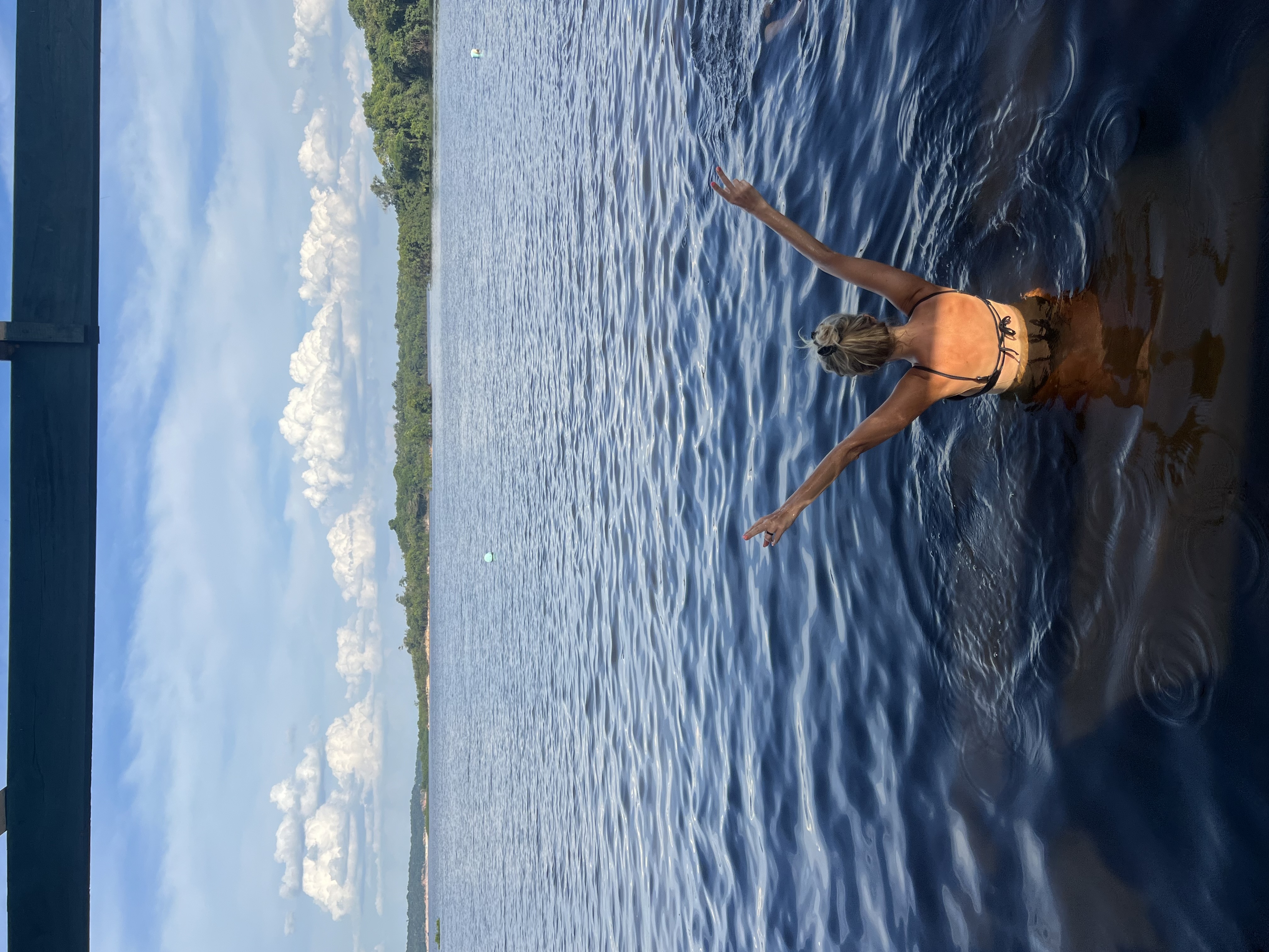 Przy okazji skorzystałam też z okazji, żeby na chwilę wykąpać się w Rio Negro. Woda była zaskakująco ciepła – praktycznie jak zupa – więc sama kąpiel była bardzo komfortowa. Nie ukrywam jednak, że nie trwała długo, bo gdzieś z tyłu głowy miałam myśl, że w tej samej rzece żyją przecież piranie i różne inne stworzenia.