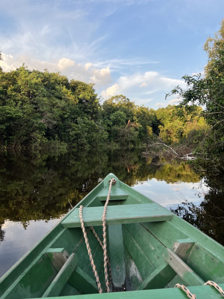 Po spacerze przyszedł czas na płynięcie łódką po Amazonce. To jedna z największych rzek świata – produkuje około 20% słodkiej wody na naszej planecie – więc nawet w rejonach, które odwiedzaliśmy, robi ogromne wrażenie. Woda była spokojna, co ułatwiało obserwację otaczającej przyrody, a wzdłuż brzegów widać było bujną dżunglę i drzewa zalane wodą. Podczas rejsu można zobaczyć różne ptaki, a czasem również ssaki i ryby w ich naturalnym środowisku. Ta część wycieczki zrobiła na mnie naprawdę duże wrażenie. W grudniu poziom wody był wysoki, dlatego mogliśmy płynąć niemal bezpośrednio między zalanymi drzewami, co daje zupełnie inne doświadczenie niż zwykły rejs po szerokiej rzece. Wokół panował spokój, a jedynymi dźwiękami były odgłosy ptaków i szum dżungli – idealna okazja, żeby przyjrzeć się przyrodzie z bliska i w ciszy obserwować otoczenie.