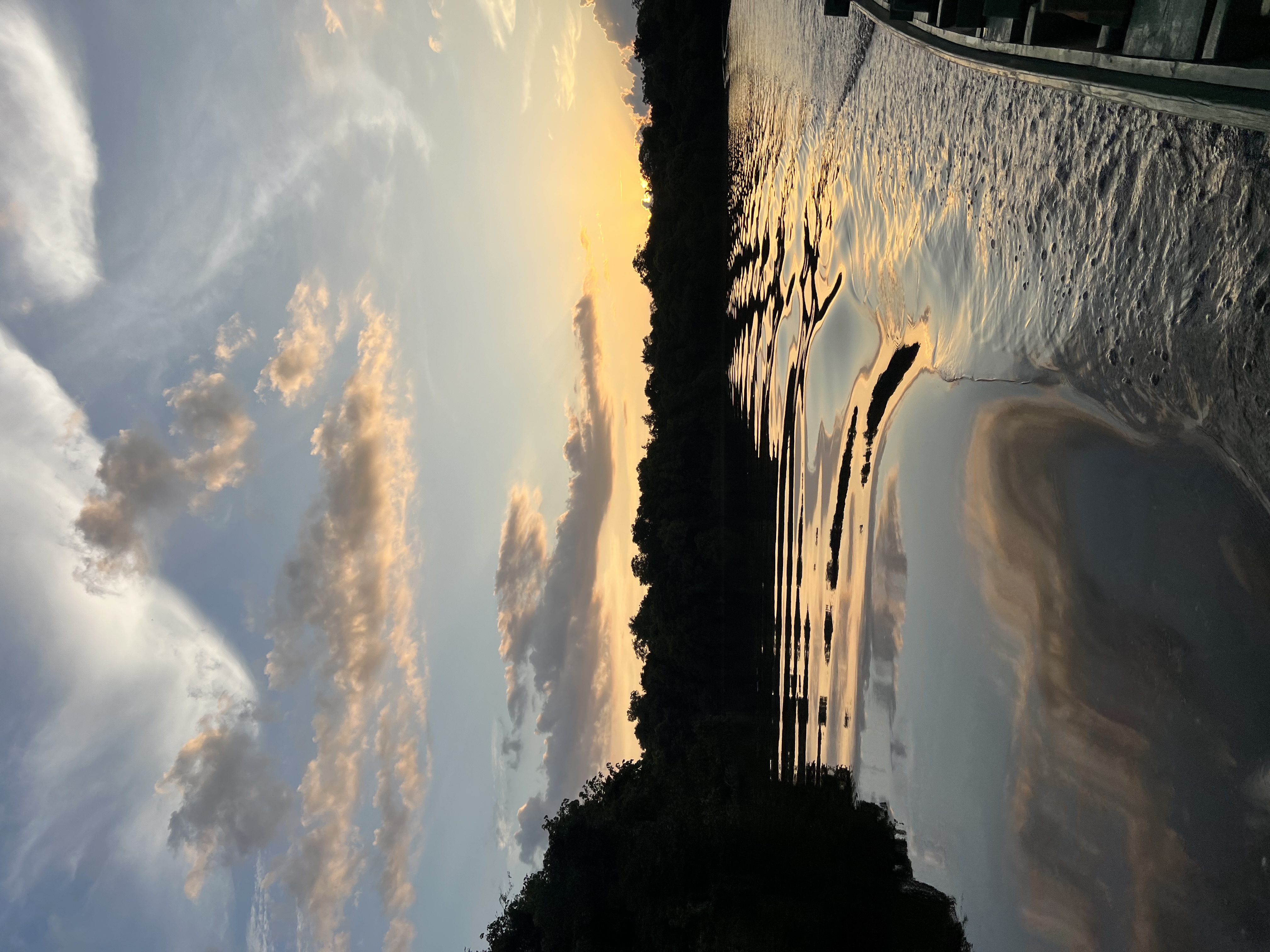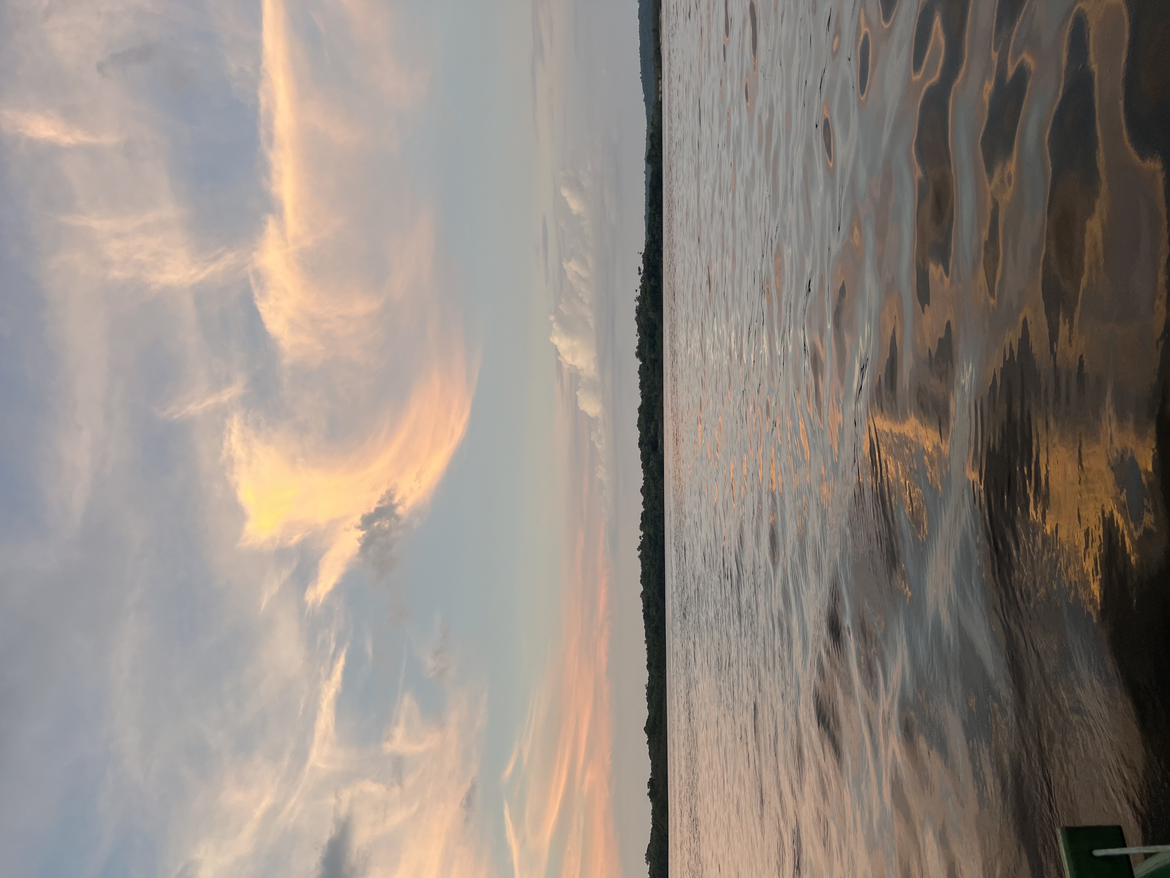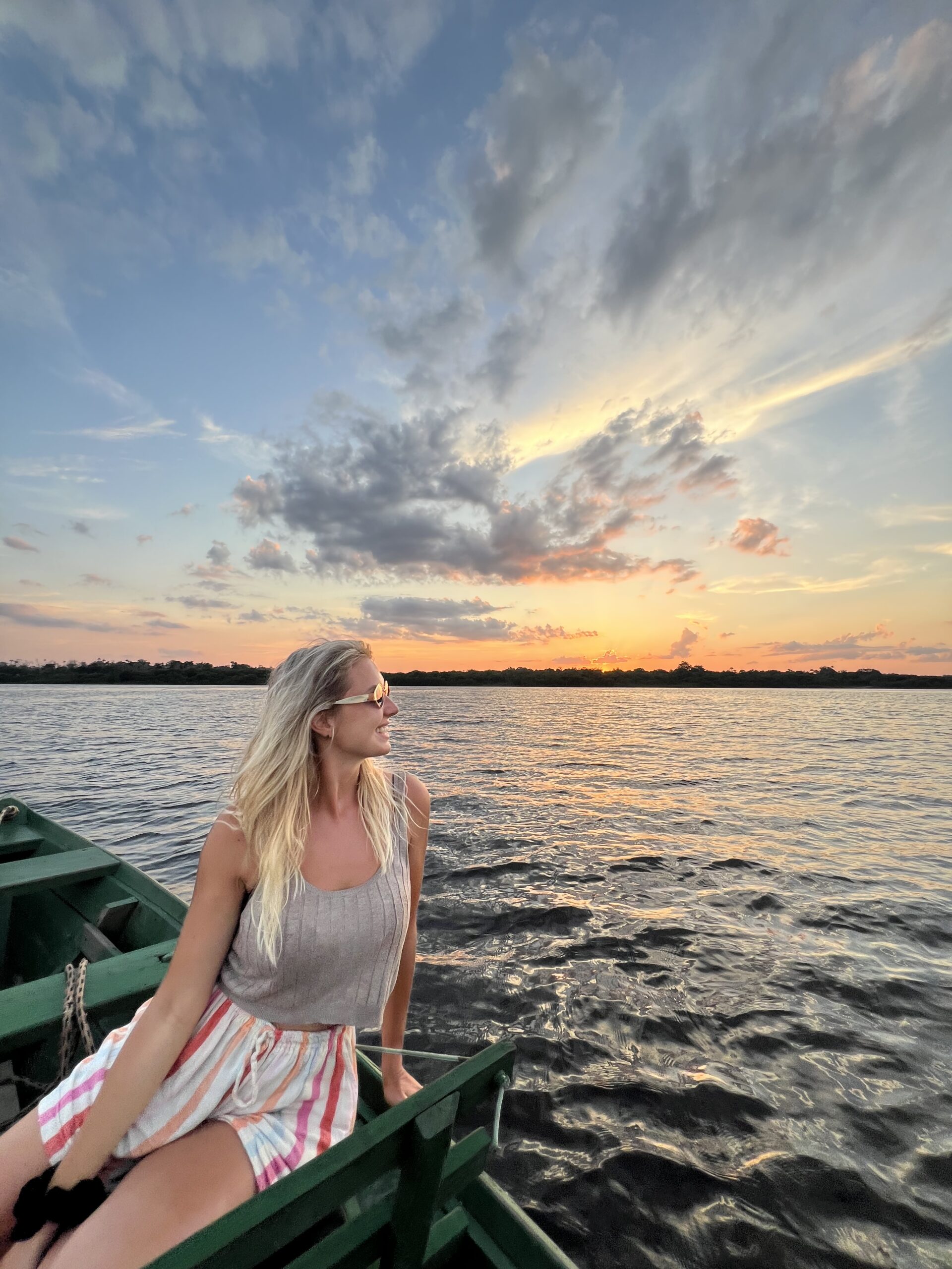 Pod koniec dnia zatrzymaliśmy się na rzece, aby obserwować zachód słońca. W Amazonii zmrok zapada szybko, a światło w krótkim czasie zmienia się z jasnego w intensywnie pomarańczowe, a następnie w głęboki granat. To moment przejścia między dzienną a nocną aktywnością zwierząt, bo część ptaków cichnie, a zaczynają być słyszalne owady i płazy.