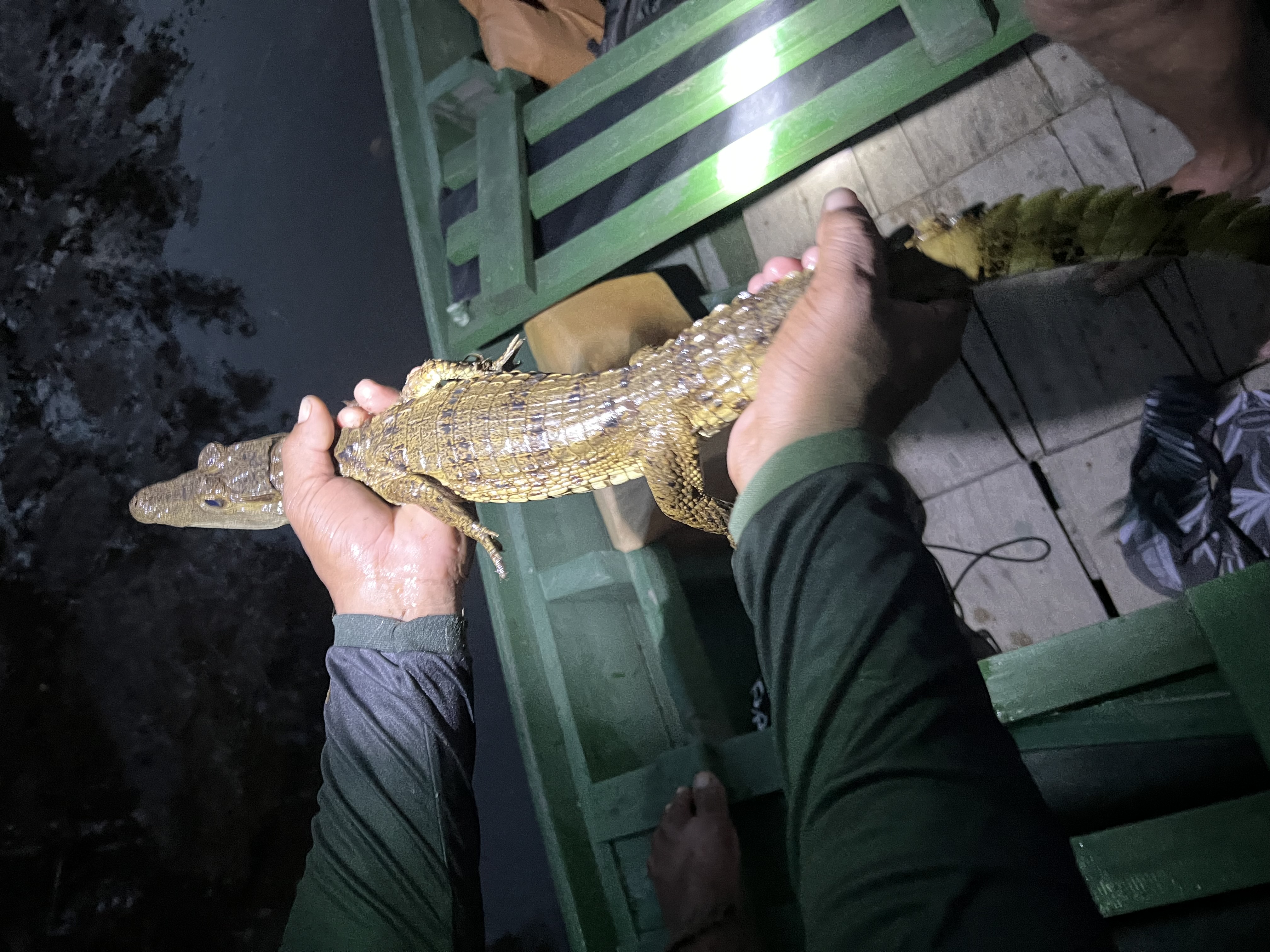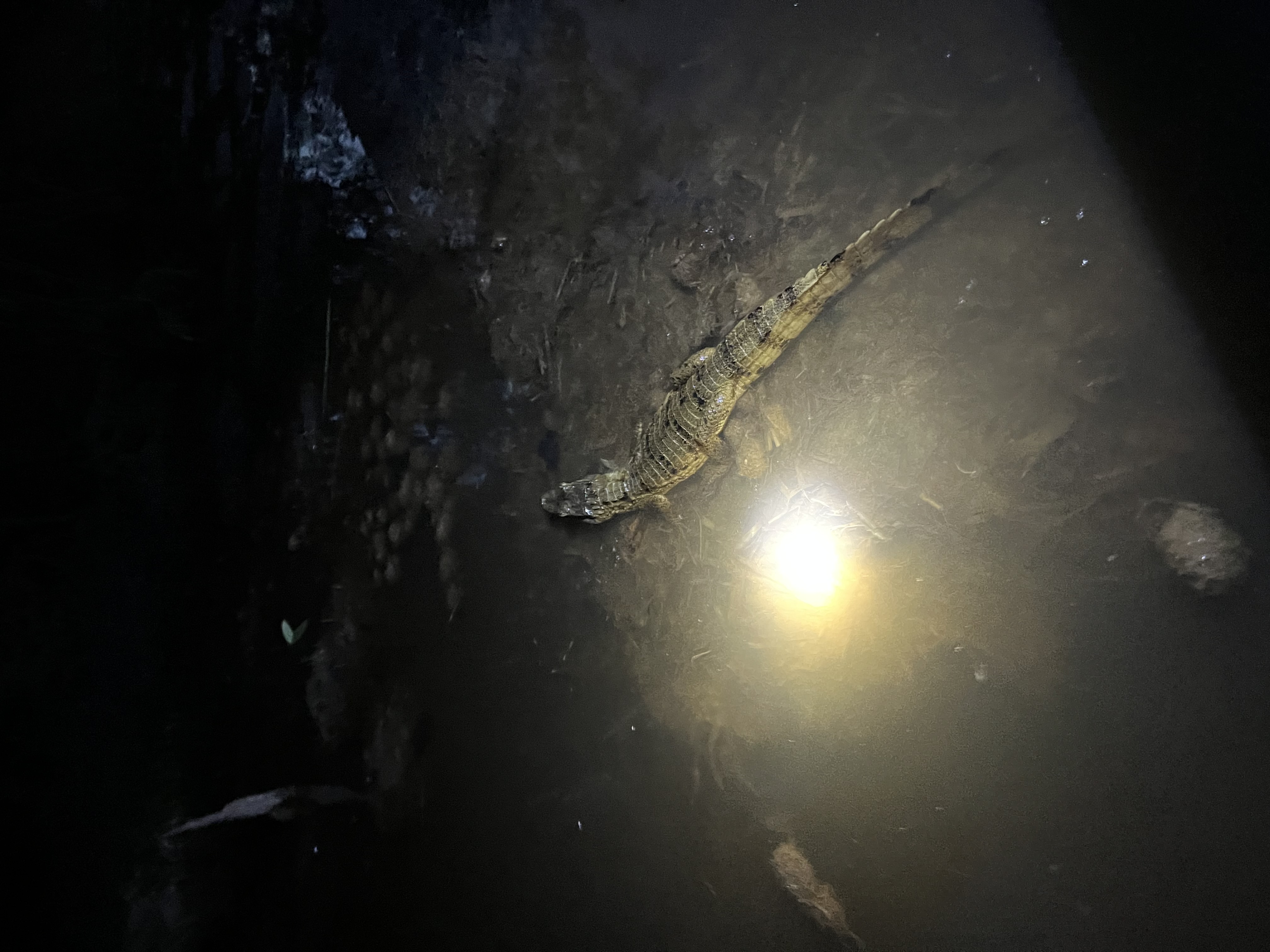 Nasz przewodnik wypatrzył jednego z nich przy brzegu. Podpłynęliśmy powoli, a on sprawnym ruchem złapał młodego osobnika i na chwilę przyniósł go do łodzi, żeby pokazać nam z bliska budowę ciała — twardą, pancerną skórę, długi ogon i charakterystyczny pysk. Byłam w szoku, bo wszystko działo się bardzo szybko i w całkowitej ciemności. Kajman po krótkiej prezentacji został wypuszczony z powrotem do wody. Dorosłe kajmany mogą osiągać ponad 2 metry długości, ale podczas turystycznych wypraw najczęściej pokazuje się młode sztuki, które łatwiej bezpiecznie uchwycić i szybko wypuścić. Ale to była kolejna kwestia, która wprawiła mnie w zakłopotanie…