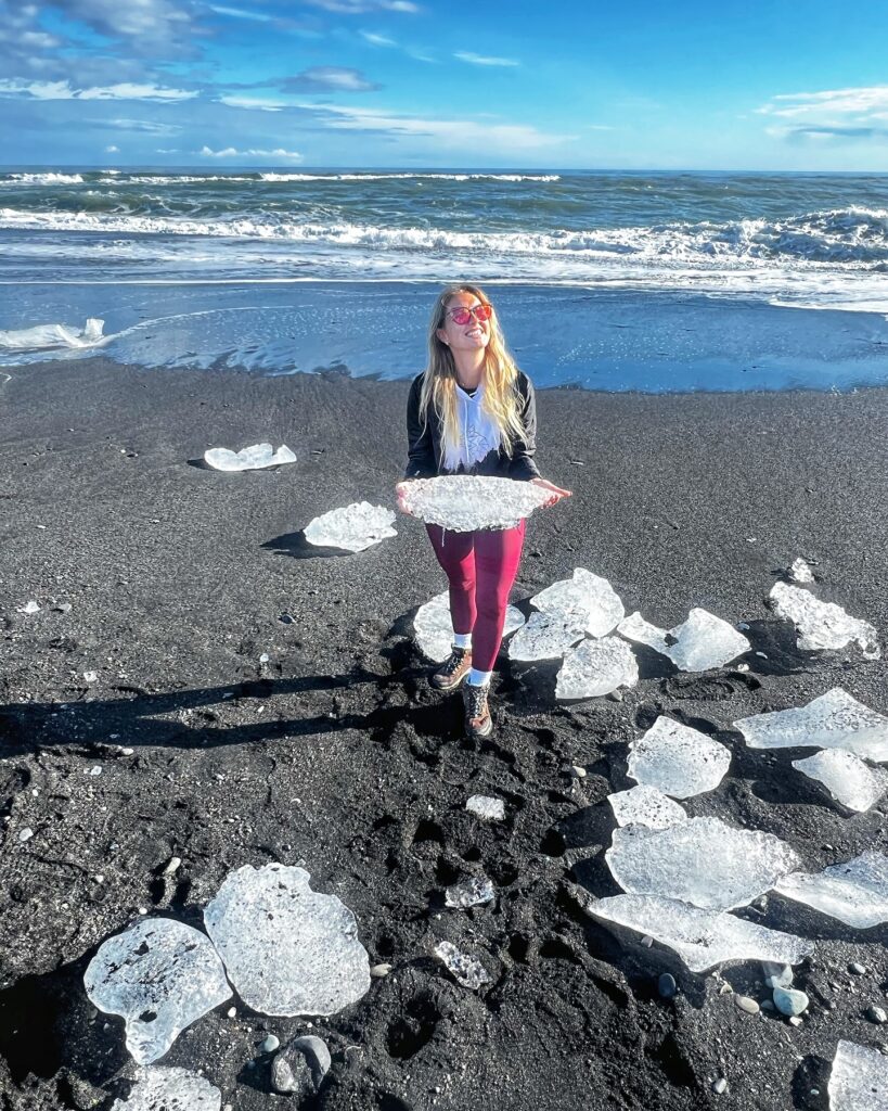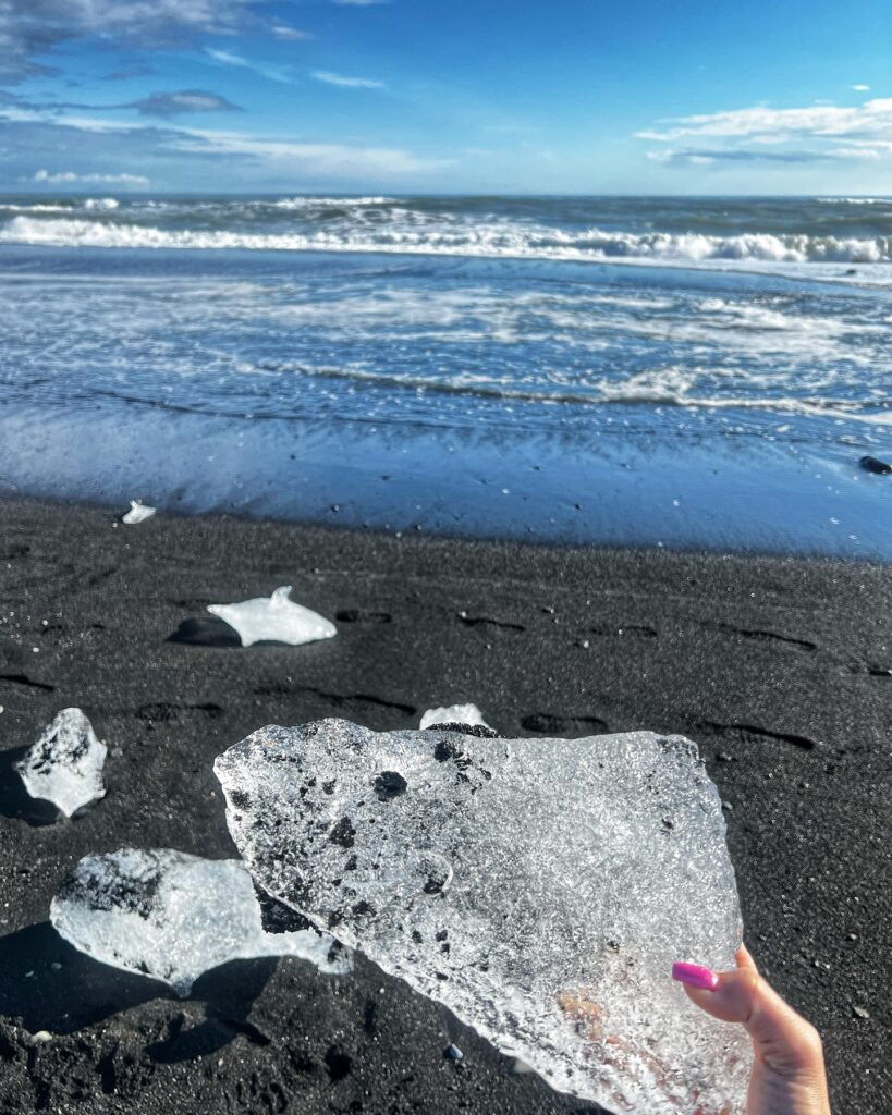 Bryły lodu płyną wąskim przesmykiem do oceanu, a stamtąd fale wyrzucają je na słynną Diamentową Plażę, która znajduje się zaledwie 500 m od laguny. To odcinek czarnego piasku, na którym lodowe kawałki mienią się niczym diamenty w promieniach słońca – stąd też jej turystyczna nazwa. 💎✨🌊