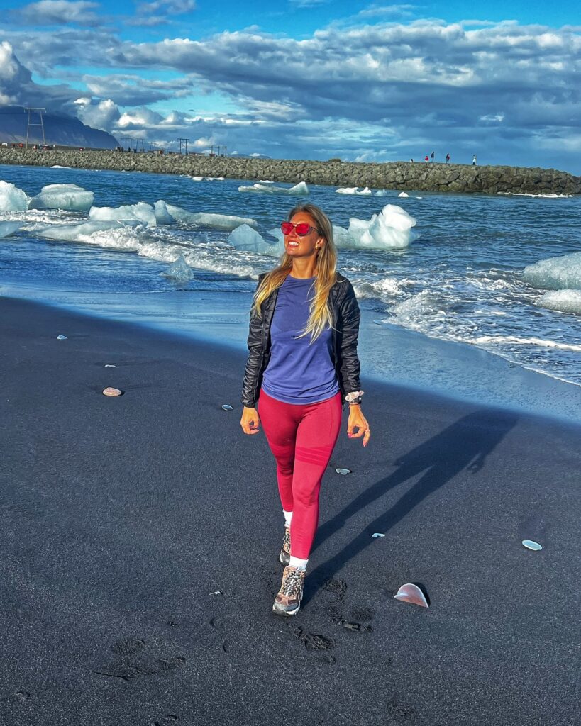Wróciłam w to niesamowite miejsce ponownie w październiku. Choć brył lodu było nieco mniej, wciąż można było je dostrzec w oddali. Na Diamentowej Plaży było spokojnie – ocean wyrzucił lodowe kawałki w większych formach, co dawało niezwykły efekt wizualny.