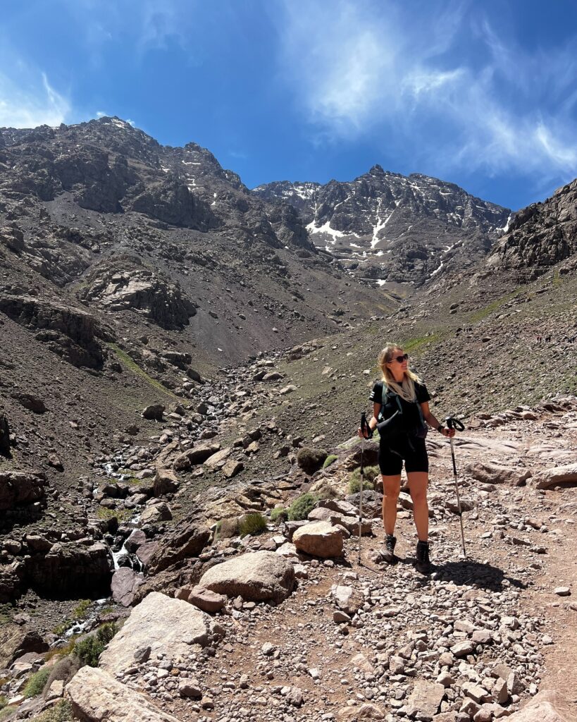 Zaczynasz w wiosce Imlil, położonej na wysokości ok. 1740 m n.p.m. Przed Tobą ok. 11–12 km trekkingu i ok. 1460 m przewyższenia – przy spokojnym tempie zajmie to 5–8 godzin z przerwą na obiad. Po drodze mijasz m.in. Sidi Chamharouch (2310 m) – miejsce pielgrzymkowe z białym marabutem. Trasa jest malownicza, z możliwością zakupu świeżo wyciskanych soków i lokalnych przekąsek. Choć podejście jest długie, jest technicznie łatwe.