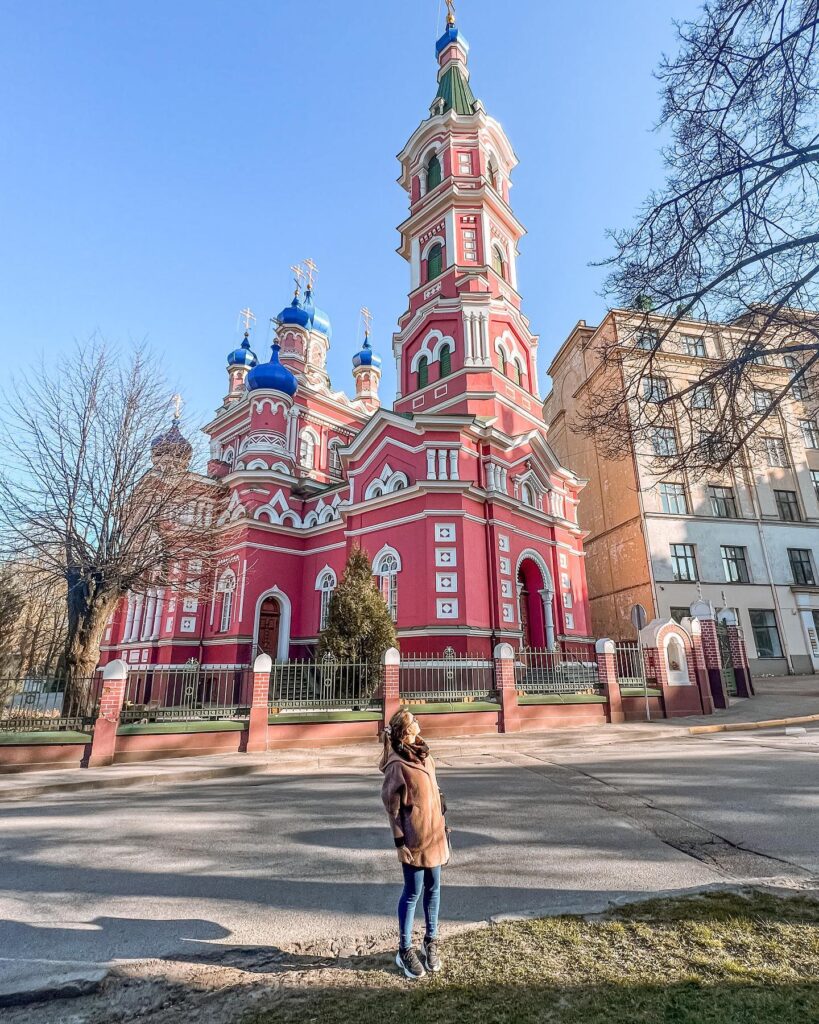 Kolejnym punktem po tej stronie jest Cerkiew Świętej Trójcy w Rydze. Zobaczyłam u koleżanki na Instagramie ten przepiękny różowy budynek z niebieskimi oraz złotymi kopułami i uznałam, że warto nadrobić kolejne 30 minut drogi, aby zobaczyć go na żywo. Niestety cerkiew była zamknięta w środku, więc cieszyłam oczy jej pięknem tylko z zewnątrz.