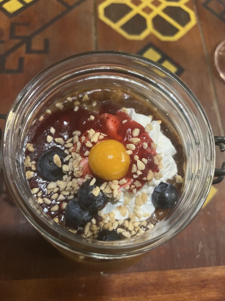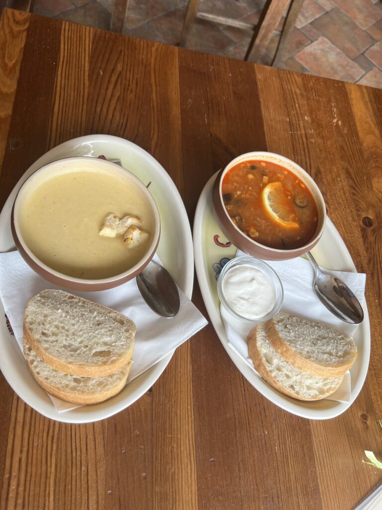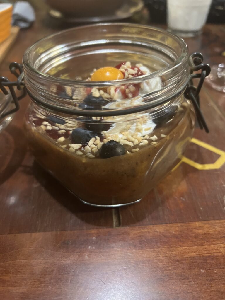Ja jestem wege więc wybrałam deser o pięknej nazwie Maizles zupa. To tradycyjny deser z ciemnego chleba żytniego, przypraw, cukru i suszonych owoców. Chleb jest najpierw moczony, a następnie przecierany przez sito, tworząc bazę zupy. Do tego dodaje się suszone owoce i przyprawy, a całość podaje się schłodzoną, często z bitą śmietaną na wierzchu. Smak jest ciekawy i inny niż typowe desery, lekko słodki z wyczuwalnym aromatem chleba i przypraw. Powiem Wam, było pyszne!