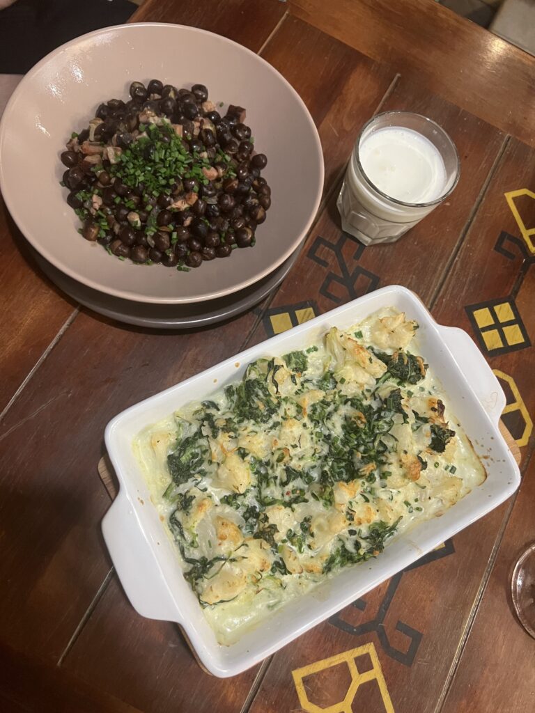 Pierwszym było danie szary groch ze słoniną (Pelēkie zirņi ar speķi). To tradycyjna potrawa, w której duże, szare ziarna grochu gotuje się z cebulą i sporą ilością słoniny, a całość podaje się z kefirem – fermentowanym napojem mlecznym. Danie jest szczególnie popularne zimą i podczas świąt Bożego Narodzenia. Szary groch ma brązową skórkę i szary środek, a jego uprawy są chronione unijnym oznaczeniem PDO. Smak jest prosty, ale bardzo charakterystyczny – słonina dodaje głębi, a kefir równoważy całość lekko kwaskowatym posmakiem.