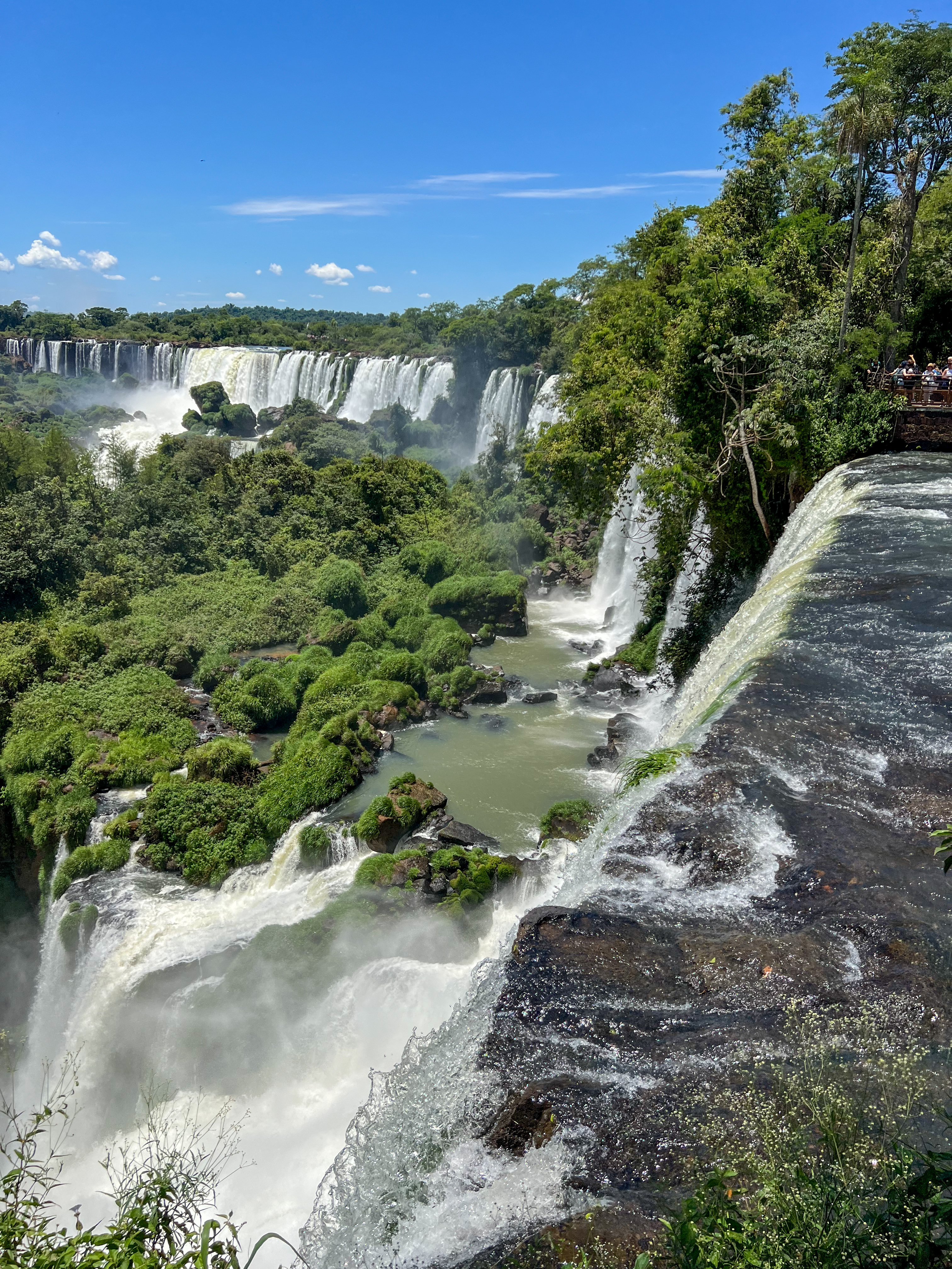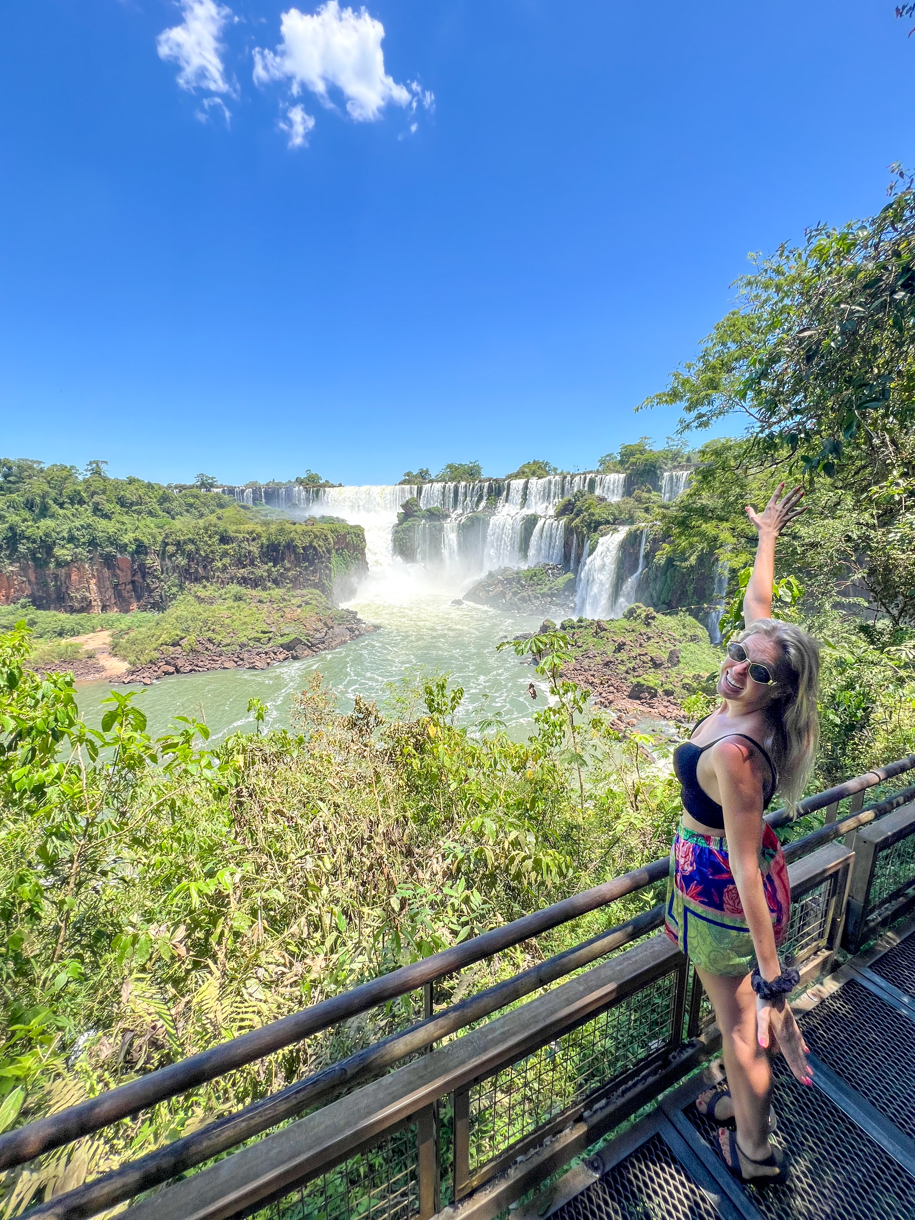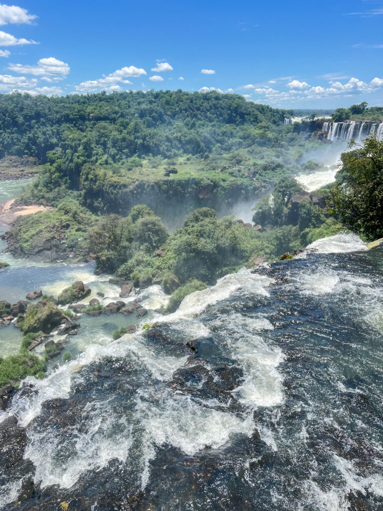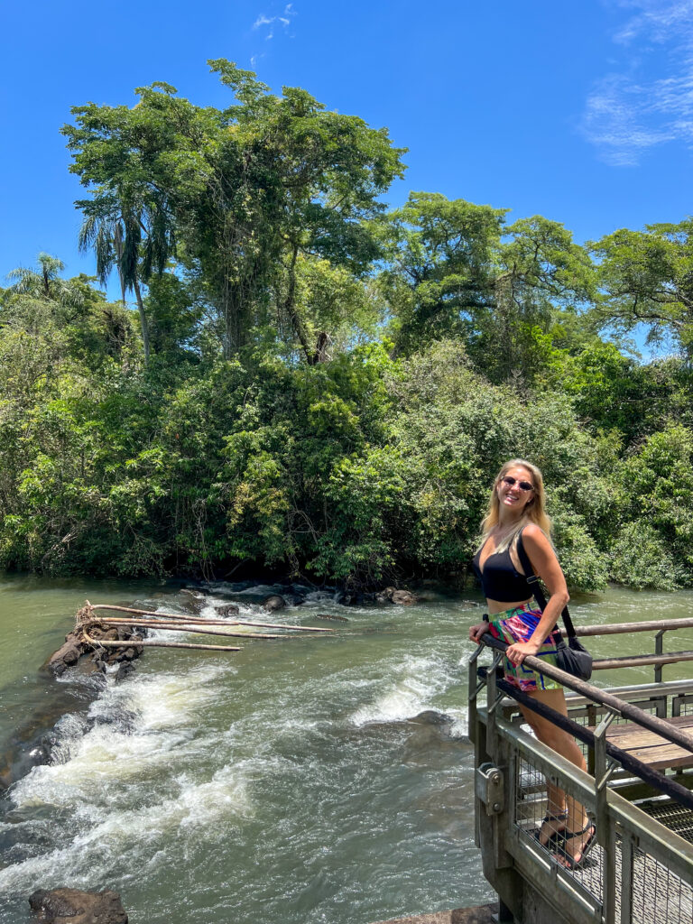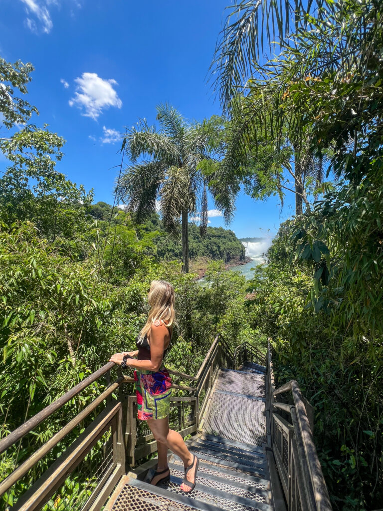 Trasa: 1,2 km kładką przez wyspy nad rozlewiskiem rzeki Iguaçu → główna platforma widokowa 82 m nad największą kaskadą świata (150 m szerokości).
